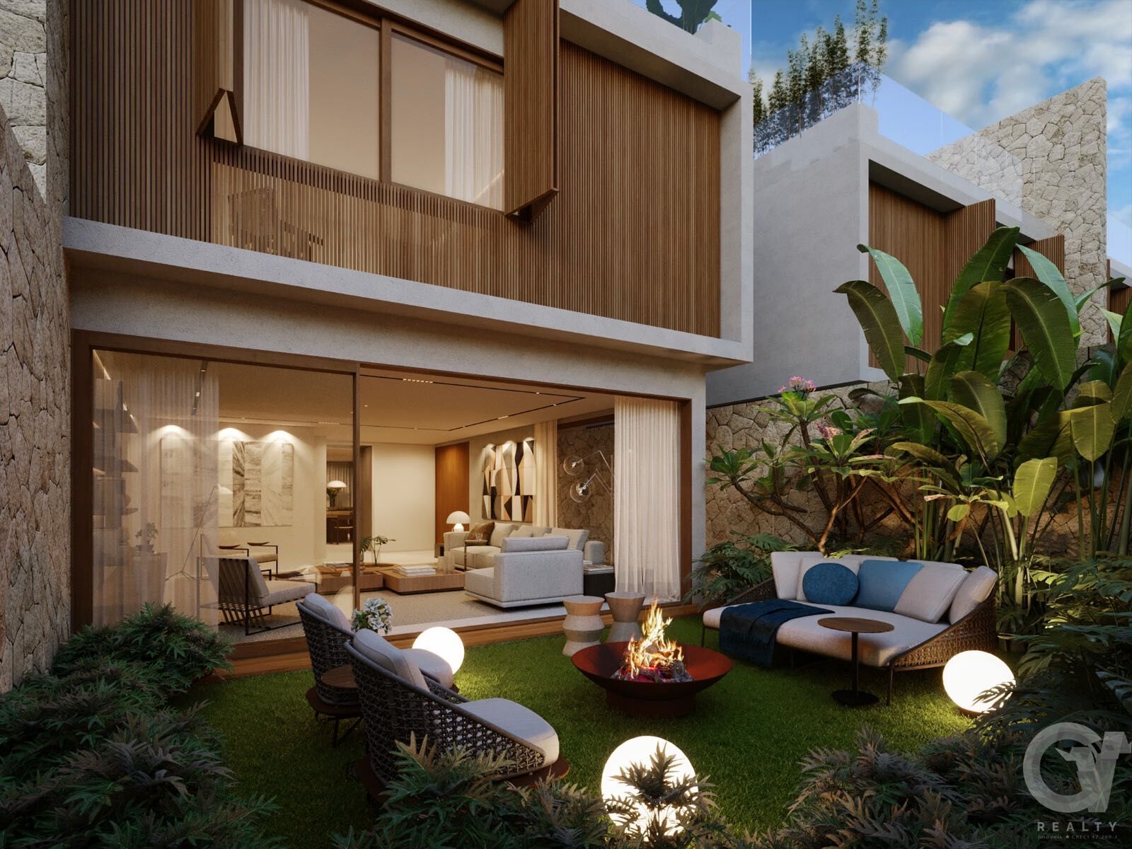 Térreo: living, cozinha e jardim privativo, elevad